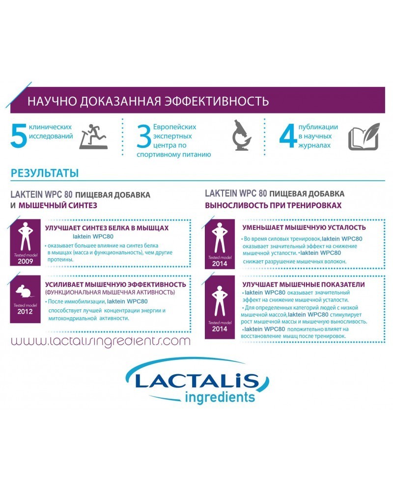 Концентрат сывороточного белка Laktein WPC 80 — быстроусвояемый 80% протеин, по праву можно считать самым качественным сывороточным белком, так как производится на прямую из молока, а не цедится из сыворотки как прочие. Это позволило достичь очень мелкой фракции, что говорит о максимальном усвоении и высокой биологической ценности.