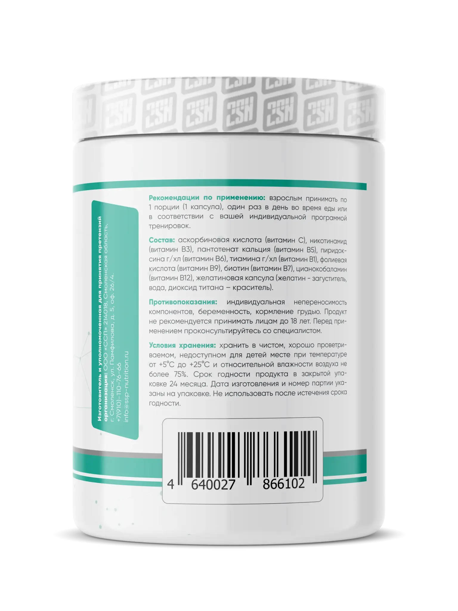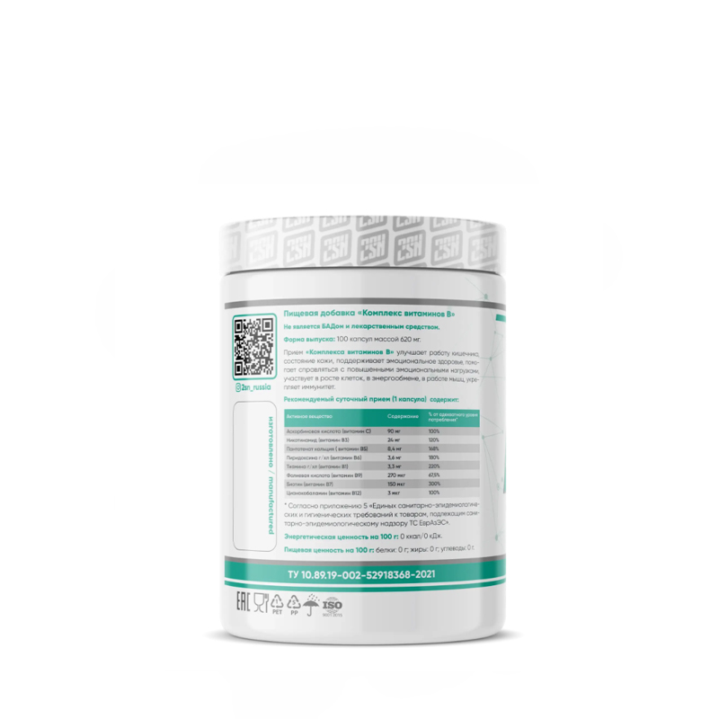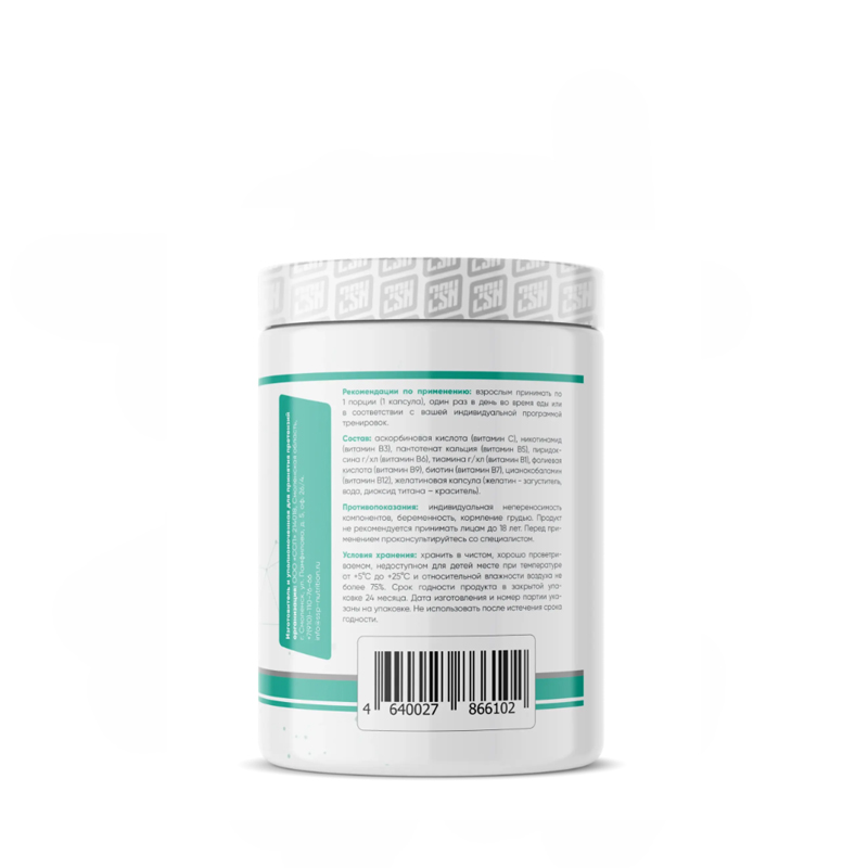 Состав: аскорбиновая кислота (витамин С), никотинамид (витамин В3), пантотенат кальция (витамин В5), пиридоксина ш/хл (витамин В6), тиаминаг/хл (витамин В1), фолиевая кислота (витамин В9), биотин (витамин В7), цианокобаламин (витамин В12), желатиновая капсула (желатин - загуститель, вода, диоксид титана - краситель).
