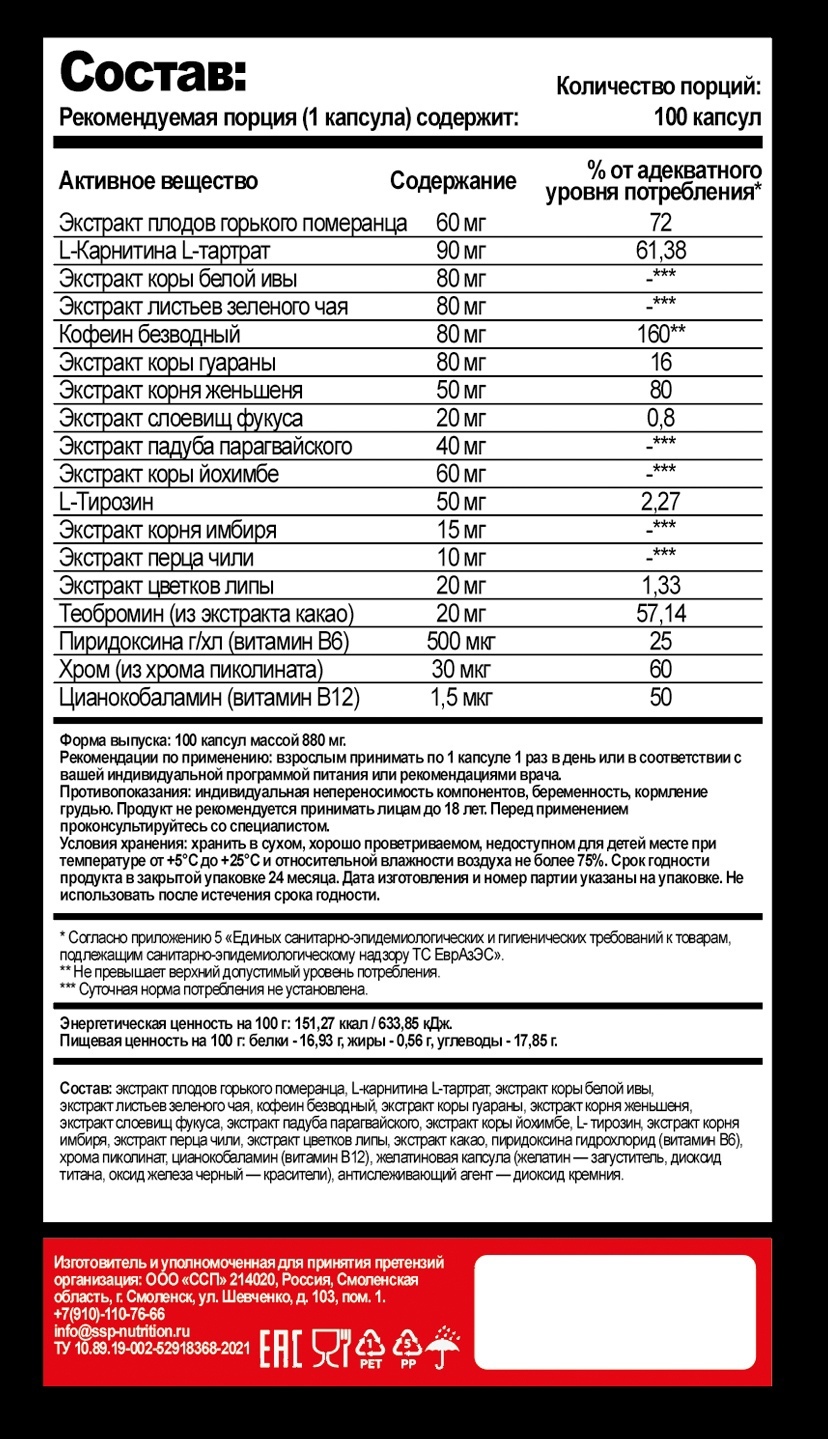 Состав: экстракт плодов горького померанца, L-карнитин L-тартрат, экстракт коры белой ивы, экстракт листьев зеленого чая, кофеин безводный, экстракт коры гуараны, экстракт корня женьшеня, экстракт слоевищ фукуса, экстракт падуба парагвайского, экстракт йохимбе, L-тирозин, экстракт корня имбиря, экстракт перца чили, экстракт цветков липы, экстракт какао, пиридоксина гидрохлорид (витамин В6), хрома пиколинат, цианокобаламин (витамин В12),желатиновая капсула (желатин - загуститель, диоксид титана, оксид железа черный - красители), антислеживающий агент - диоксид кремния.