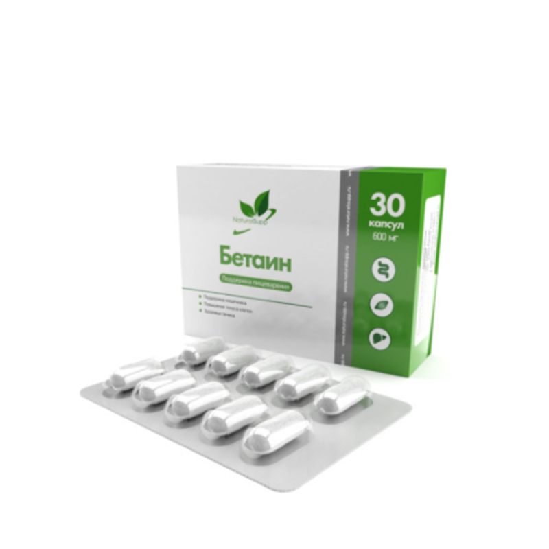 Бетаин способствует выработке глутатиона, который обладает мощным антиоксидантным действием. Бетаин обладает гепатопротекторным свойством, способствует выведению из организма токсических веществ (способствует процессу детоксикации в организме), заживлению тканей, очищению сосудов, улучшению функций печени.