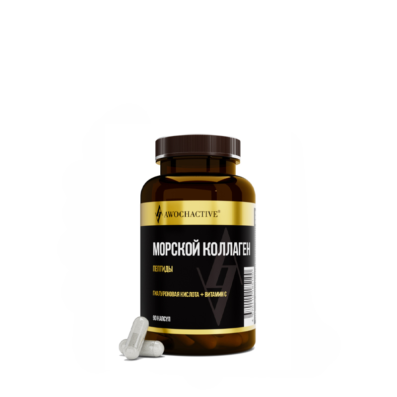 Комплекс из рыбного гидролизованного коллагена, гиалуроновой кислоты и витамина С от Awochactive. Упаковка: 90 капсул.