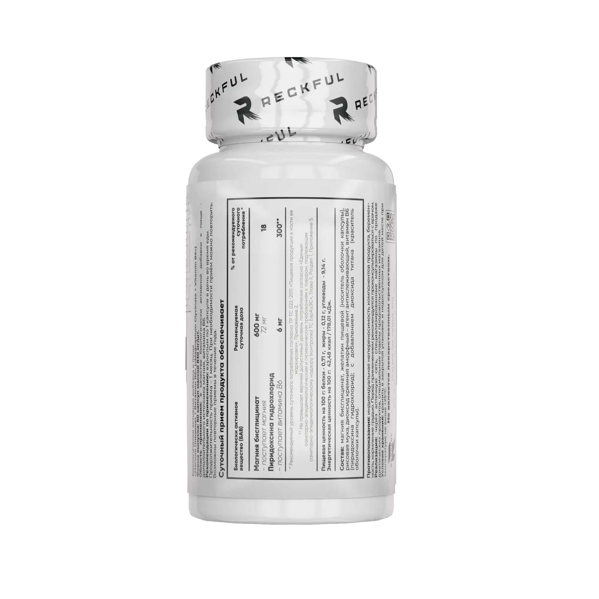 Magnesium Glycinate + в6 в капсулах от компании Reckful является хелатной формой магния. Данная органическая форма считается одной из наиболее биодоступных и легко усвояемых, комфортна для пищеварения и не дает слабительный эффект. Magnesium бисглицинат + витамин б6 отлично подходит как для мужчин, так и для женщин. Помогает справиться с синдромом хронической усталости и тазовой боли, головными болями, апатией, депрессией и беспокойством. Хорошо успокаивает нервную систему, борется со стрессом и чувством тревоги. Также магнезиум может применяться как витамины при лечении болезней сердца, диабета, воспалительных процессов. Органическая форма глицината магния эффективна при судорогах ног и других конечностей, что особенно актуально при физической активности в жаркую погоду или при наличии большого количества кардио нагрузки. Также применяется как добавка для сна - повышает его качество, улучшает засыпание. Еще одной особенностью магния является его действие по облегчению предменструального синдрома (ПМС) и других нарушений, связанных с менструальным циклом у женщин. Рекомендации по применению: взрослым по 1 капсуле в день во время еды.