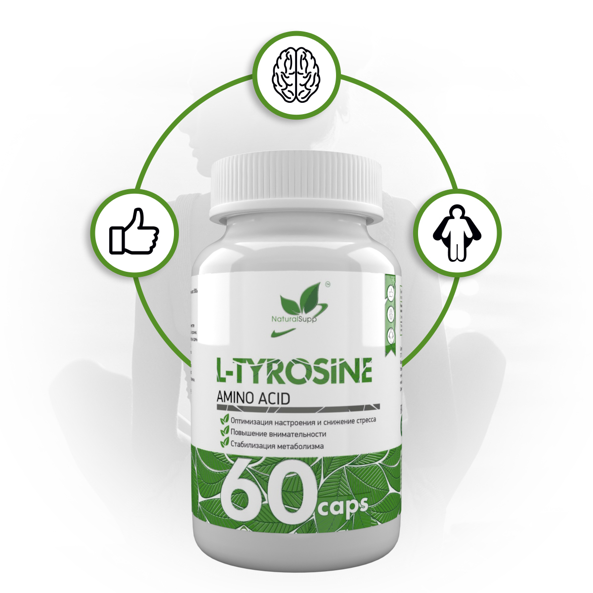 Среди его свойств - улучшение концентрации внимания, памяти и мозговой активности, также L - тирозин помогает подготовиться к физическим нагрузкам. Тирозин влияет на производство нейромедиаторов, поэтому защищает от тревоги и депрессивных состояний, улучшает когнитивные функции во время стресса. L - тирозин принимает активное участие в расщеплении жиров, влияет на производство гормонов тироксина и трийодтиронина, эффективен в жиросжигании. Подавляет голод, тем самым препятствует стрессу во время похудения.