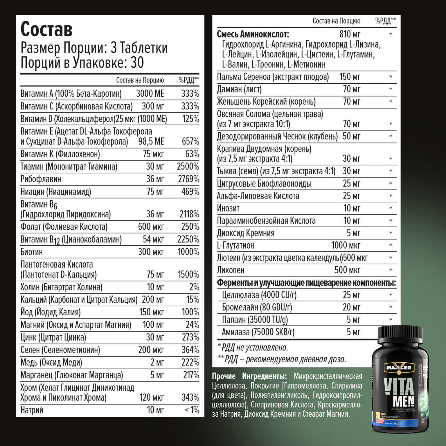 Прочие Ингредиенты: Микрокристаллическая Целлюлоза, Покрытие [Гипромеллоза, Спирулина (для цвета),Полиэтиленгликоль, Гидроксипропилцеллюлоза), Стеариновая Кислота, Кроскармеллоза Натрия, Диоксид Кремния и Стеарат Магния.