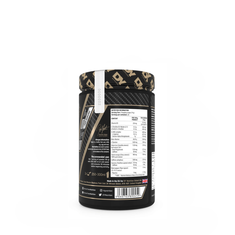 Состав: L-грулин DL-малат (2-1), бета-аланин, комплекс A.-AKG (L-аргинин, альфа-кетогулартат кальция), антислеживатели (диоксид кремния, соли кальция ортофосфорной кислоты), ароматизаторы, L-тирозин. (форма свободной аминокислоты), мальтодекстрин, кофеин безводный, экстракт листьев зеленого чая (Camellia sinensis) (стандартизированный до 95% полифенолов и 5% кофеина), подсластители (сукралоза, ацесульфам-К), сладкий апельсин (Citrus sinensis) 100% кожура экстракт, никотинамид, экстракт семян гуараны (стандартизированный до 22% кофеина), экстракт плодов черного перца (Piper nigrum)