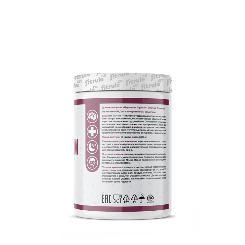 Fitrule Magnesium Glycinate – это хелатная форма магния, усиленная аминокислотой глицином. Хелатный магний имеет самую высокую биодоступность для организма
