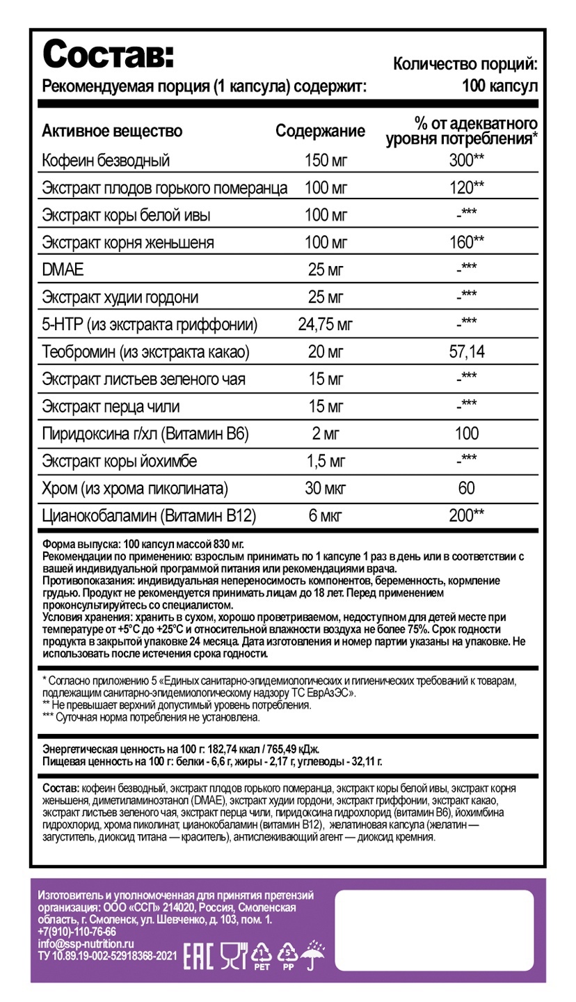 Состав: кофеин безводный, экстракт плодов горького померанца, экстракт коры белой ивы, экстракт корня женьшеня, диметиламиноэтанол (DMAE), экстракт худии гордони, экстракт гриффонии, экстракт какао, экстракт листьев зеленого чая, экстракт перца чили, пиридоксина гидрохлорид (витамин В6), йохимбирна гидрохлорид, хрома пиколинат, цианокобаламин (витамин В12),желатиновая капсула (желатин - загуститель, диоксид титана, оксид железа черный - красители), антислеживающий агент - диоксид кремния.