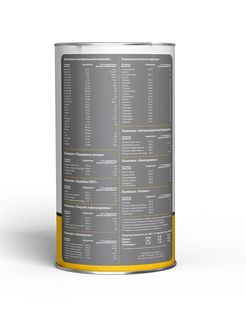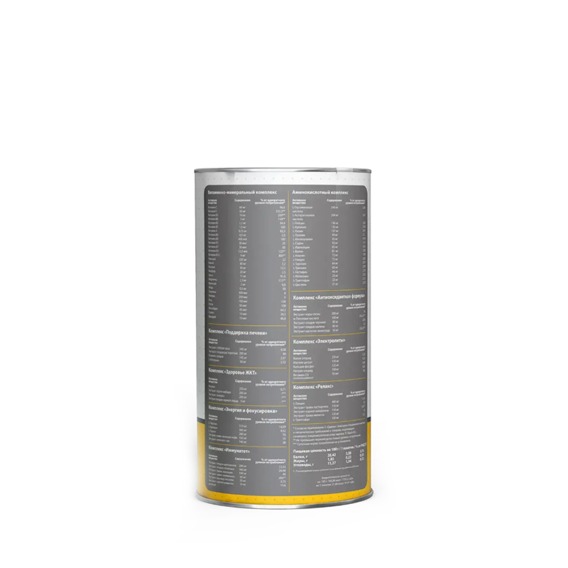Комплекс «Энергия и фокус» (таблетка красного цвета): L-тирозин, L-аргинин, L-таурин, экстракт семян зеленого кофе, экстракт зеленого чая, наполнители - микрокристаллическая целлюлоза, крахмал; разрыхлитель – тальк; антислеживающие агенты - стеариновая кислота, диоксид кремния.