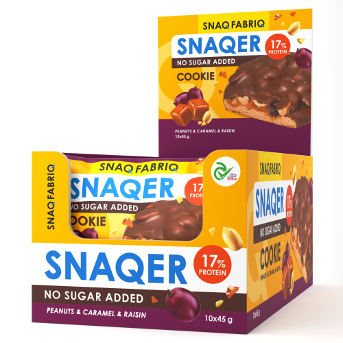 Настоящая революция в мире снэков! Настало время попробовать новое печенье SNAQER от SNAQ FABRIQ. Хрустящая основа печенья полита ароматной тягучей карамелью. Сверху много-много обжаренного арахиса и мягкого сладкого изюма. И всё это со всех сторон покрыто нежнейшим, тающим во рту, завораживающим шоколадом Snaq Fabriq.