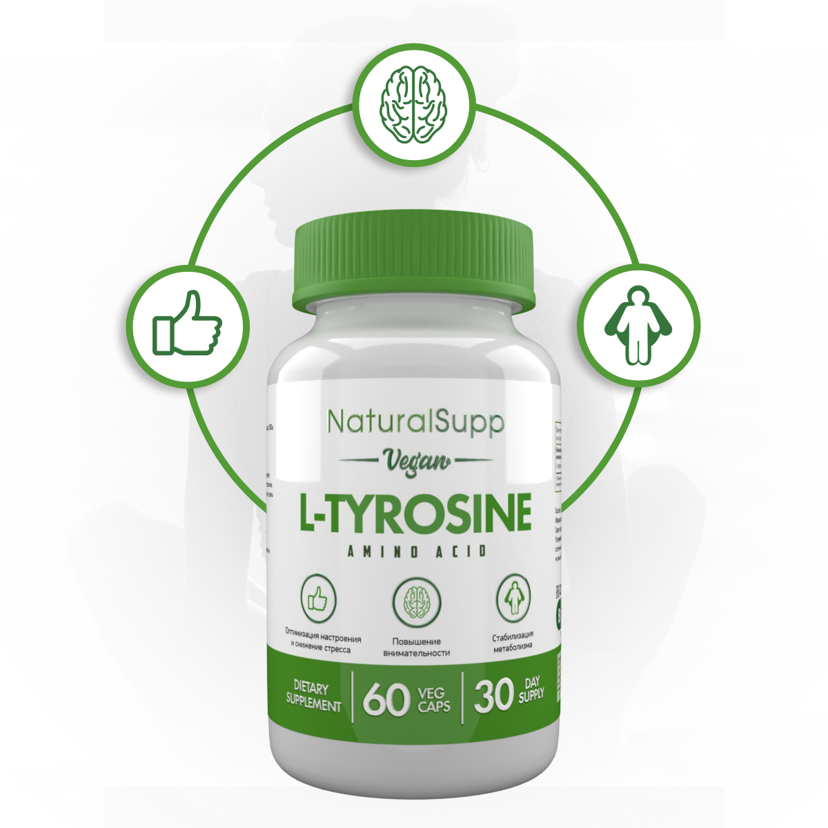 Среди его свойств - улучшение концентрации внимания, памяти и мозговой активности, также L - тирозин помогает подготовиться к физическим нагрузкам. Тирозин влияет на производство нейромедиаторов, поэтому защищает от тревоги и депрессивных состояний, улучшает когнитивные функции во время стресса. L - тирозин принимает активное участие в расщеплении жиров, влияет на производство гормонов тироксина и трийодтиронина, эффективен в жиросжигании. Подавляет голод, тем самым препятствует стрессу во время похудения.