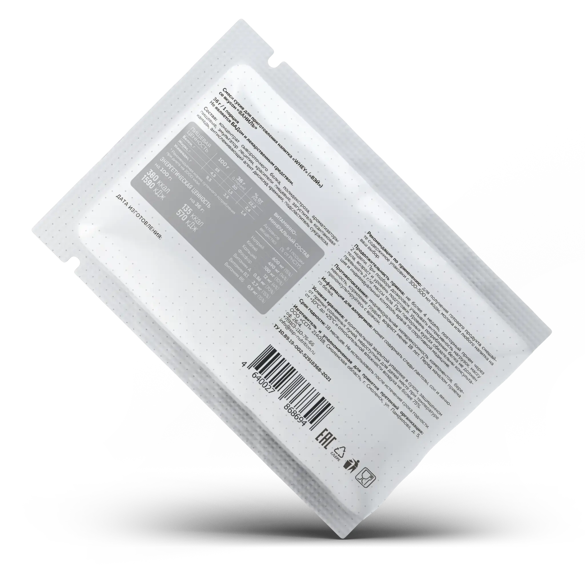 Рекомендации по применению: для получения готового продукта смешайте 1 пакетик (36г) с 300-500 мл воды, молока или любого другого напитка на ваш выбор.